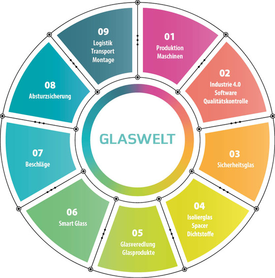 In unserem Glas Spezial im GLASWELT Heft 06/2021 finden Sie eine umfassende Zusammenstellung an aktuellen Entwicklungen rund um die Glasbranche. Damit Sie alle Innovationen und Neuheiten aus den verschiedenen Glas-Segmenten sowie den Zuliefer-Industrien schnell und zielgerichtet finden, werfen Sie am besten einen Blick auf die Grafik mit den neun Themenfeldern des Glas Spezials: