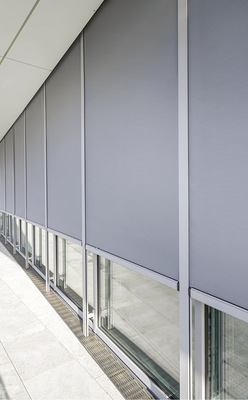 Der außenliegende Sonnenschutz ist darüber hinaus auch mit dem Fassadensystem heroal C 50 kompatibel: Die eingesetzte Reißverschlusstechnologie fixiert den Behang über die gesamte Länge der Führungsschienen, die auf Traversen an der Fassade befestigt sind.
