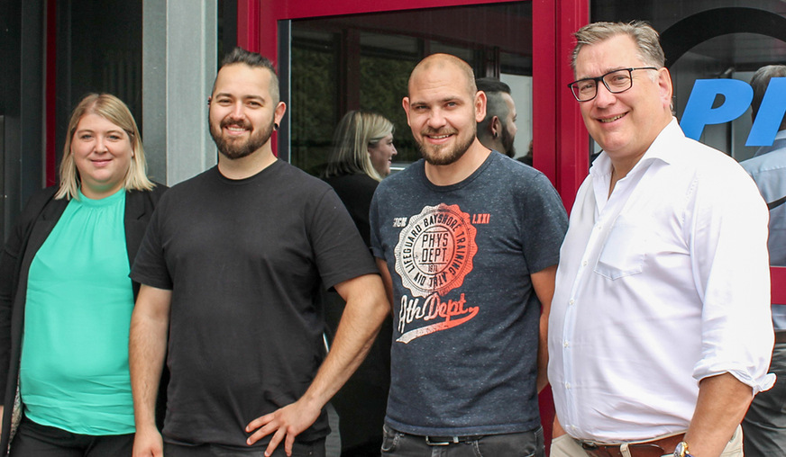 Begrüßung der neuen Mitarbeiter: PIV-Leiterin Andrea Horsthemke (l.) und Stephan Schmidt, Geschäftsführer der Gütegemeinschaft Schlösser und Beschläge (r.), mit Till Zegenhagen (2.v.l.) und Sven Bunge (2.v.r.).