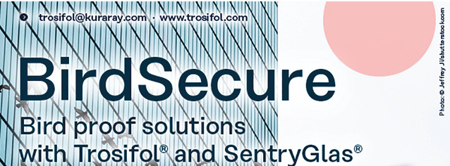 Am Stand von Kuraray finden die Besucher die neuesten SentryGlas und Trosifol-Produkte sowie neue Dienstleistungen. Im Fokus stehen, unter anderen die neuen Vogelschutzfolien Trosifol BirdSecure und SentryGlas BirdSecure.