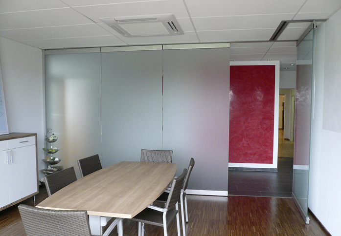 Und die Horizontal-Schiebe-Wand SF40 kommt sogar vollkommen ohne Bodenschiene aus, da hier die Glaselemente in der Deckenschiene hängen. Integrierte Türen sind hier möglich sowie Teil-Öffnungen, da jedes Element einzeln bewegt werden kann.