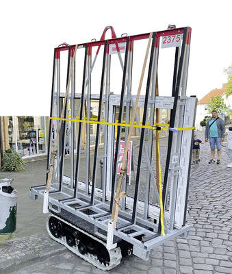Das kompakte, nur 80 cm breite Gerät passt durch Türen, Flure und enge Räume sowie in den Transporter. Um lange Elemente zu bewegen, lässt es sich mit einem Nachläufer „erweitern.“