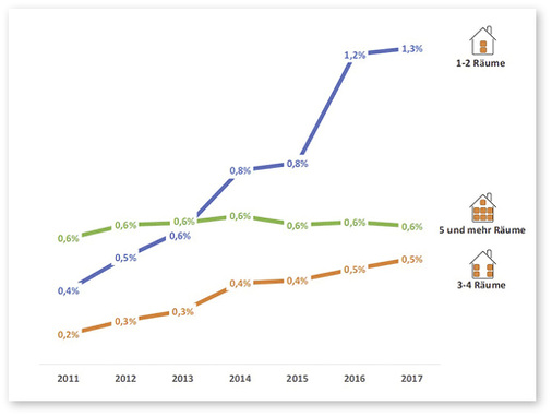 Seit 1997 hat sich der Anteil der kleinen Wohnungen mit ein und zwei Räumen um 4,1 Prozentpunkte von 8,4 auf 12,6 Prozent stark vergrößert. Im Gegensatz dazu sind Wohnungen mit drei bis fünf Räumen von 71,6 um 7,5 Prozentpunkte auf 64,1 Prozent gesunken.