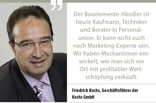 Der Herzogenrather Fensterbauer hat dieses Konzept selbst zuvor in seinem regionalen Verkaufsgebiet getestet und konnte die Erfolge nachweislich dokumentieren. Geschäftsführer Friedrich Kochs: „Der Bauelemente-Händler ist heute Kaufmann, Techniker und Berater in Personalunion. Er kann nicht auch noch Marketing-Experte sein. Doch das Marketing spielt eine entscheidende Rolle. Wir haben Mechanismen entwickelt, wie man Qualität und Service vor Ort mit profitabler Wertschöpfung verkauft.“