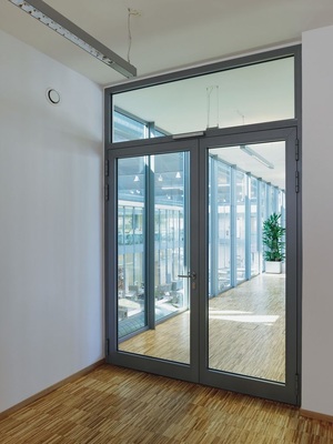 Brandschutz mit Glas: Pilkington Pyrostop in F 30-Fassadenkonstruktion zur Sicherung des Fluchtweges sowie T 30-Türsystemen zur Brand- und Rauchabschnittsbildung und bei Zugängen zu notwendigen Treppenräumen
